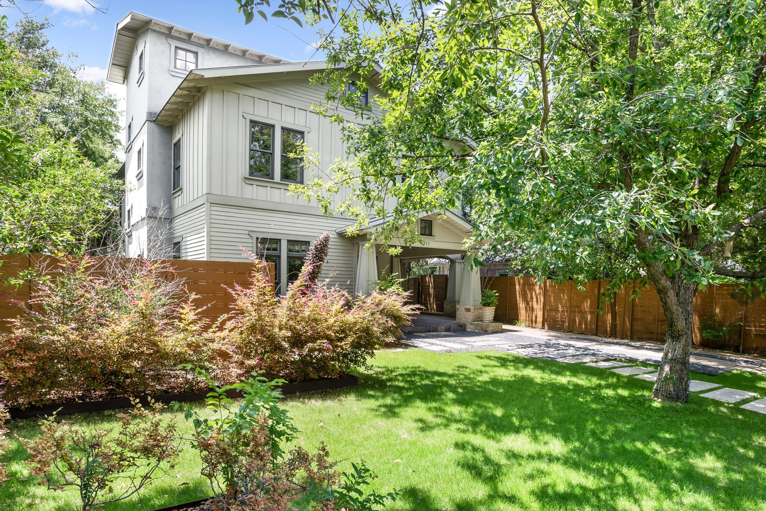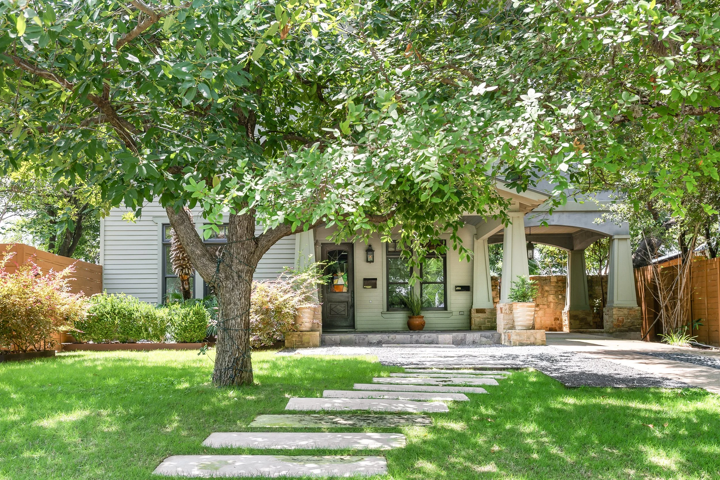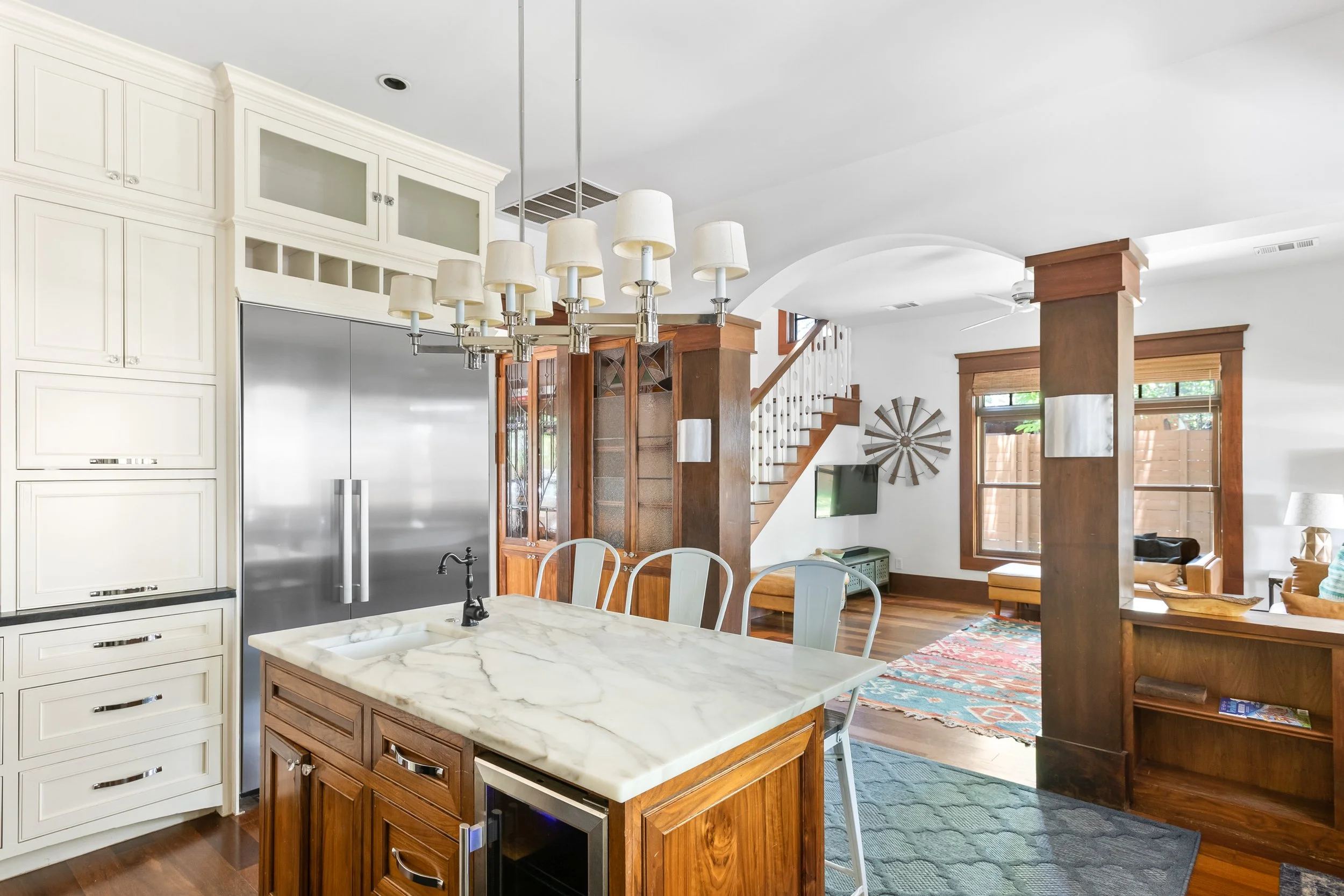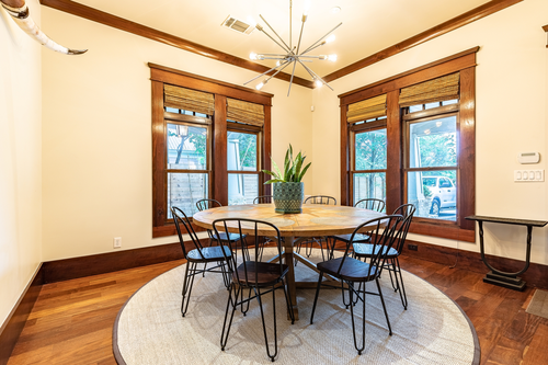 There is no shortage of spaces to enjoy quality time with friends and family. The house boasts three large living areas – one for each floor – along with four covered porches replete with ceiling fans to fend off the Texas heat. There is a large dining room table, perfect for group dinners or game nights. There is a large closet full of children’s toys, books, and a Pack ’n Play crib, convenient for families with young children. The 2-car garage, covered parking, and spacious street parking will fit any size group’s vehicles.