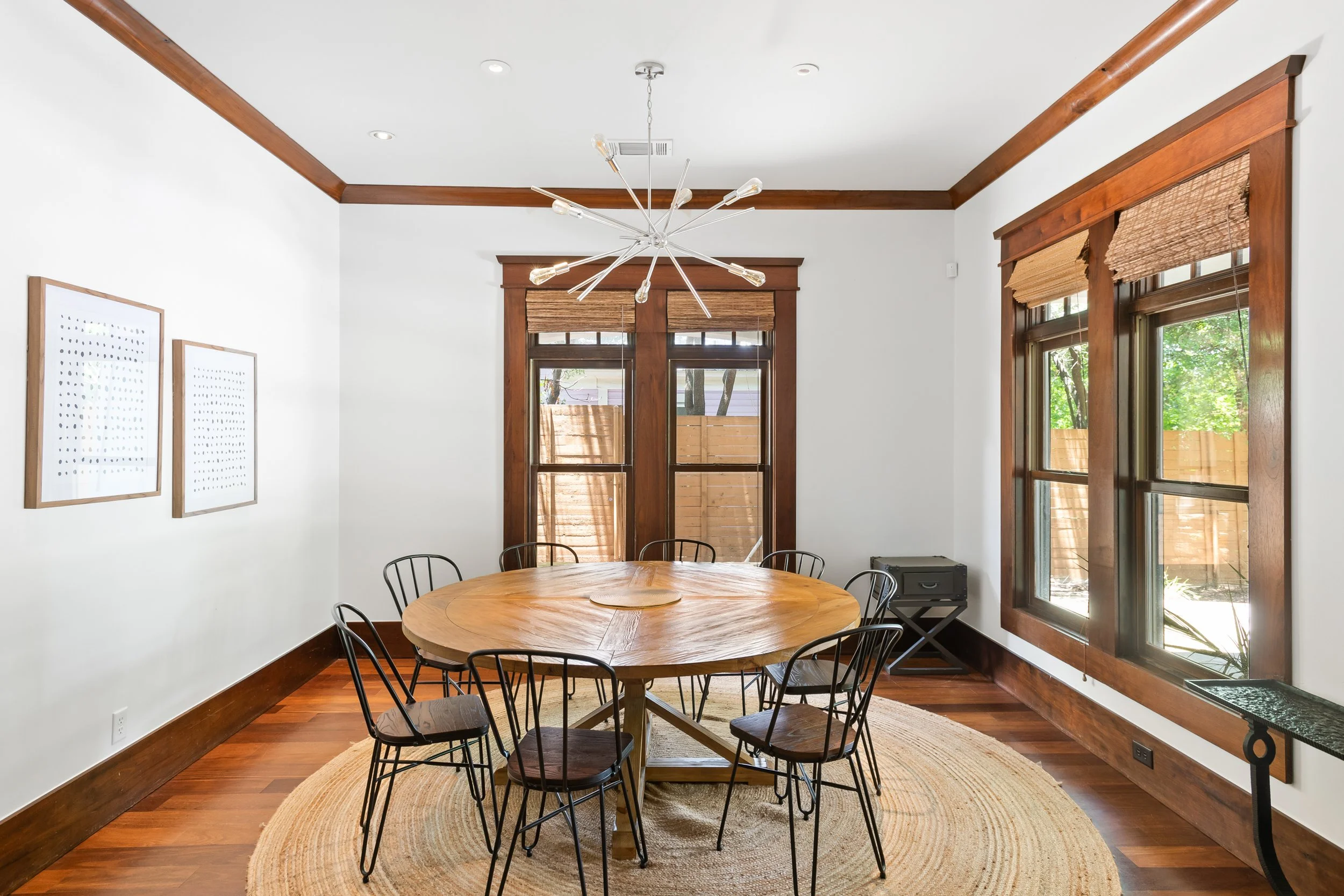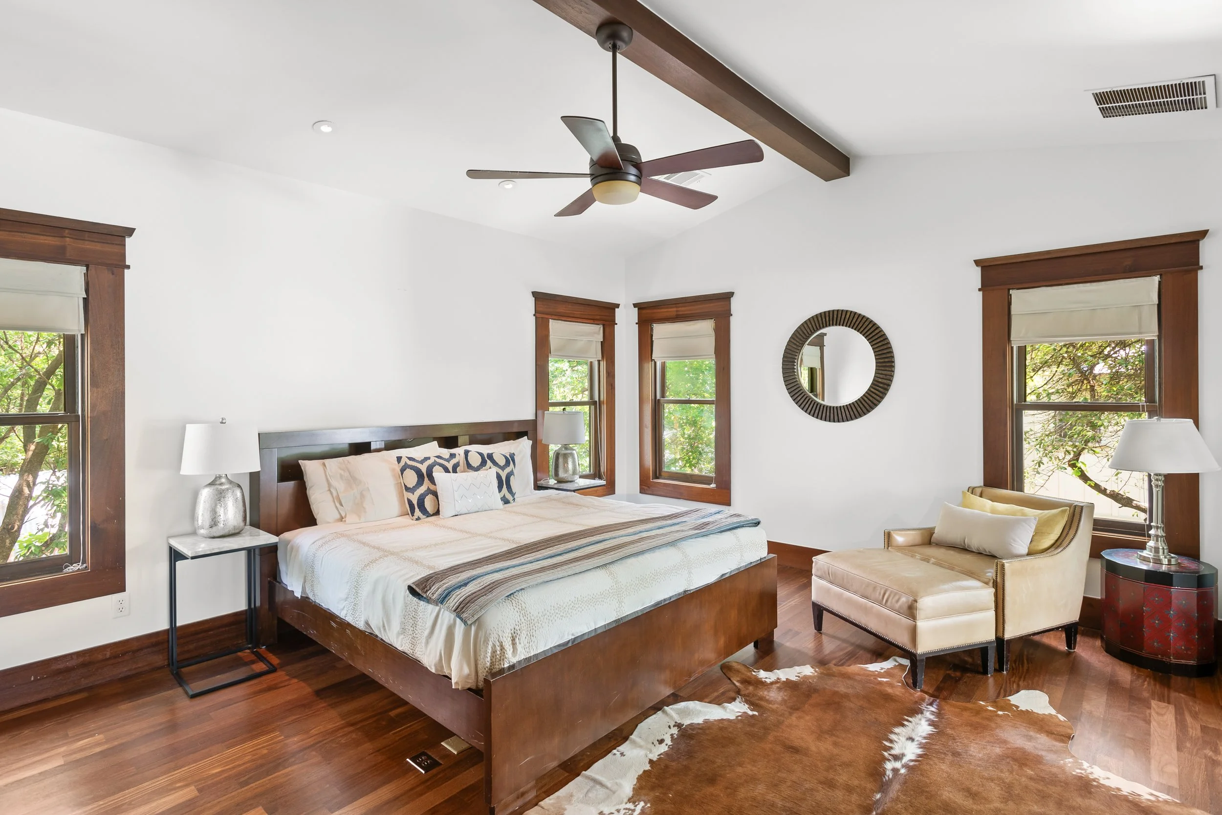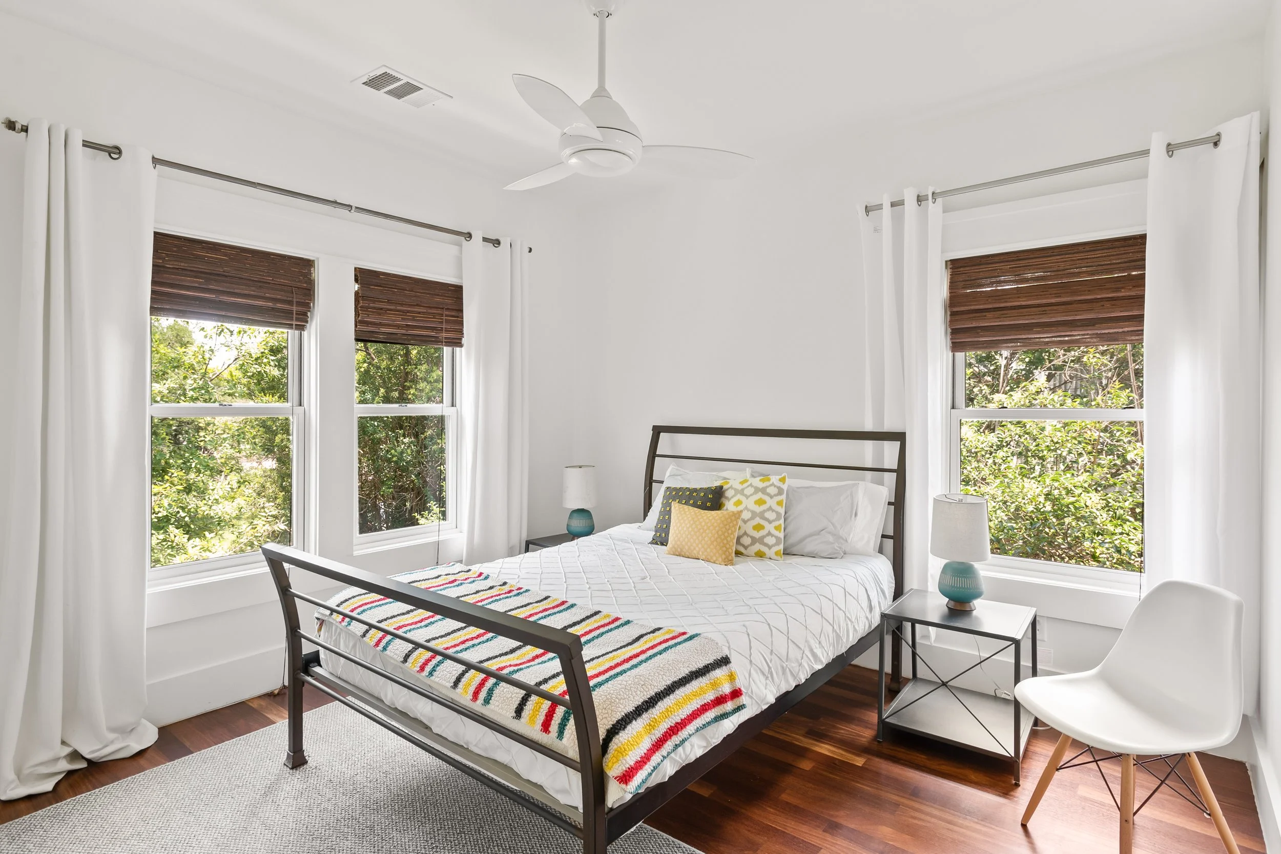 There is no shortage of spaces to enjoy quality time with friends and family. The house boasts three large living areas – one for each floor – along with four covered porches replete with ceiling fans to fend off the Texas heat. There is a large dining room table, perfect for group dinners or game nights. There is a large closet full of children’s toys, books, and a Pack ’n Play crib, convenient for families with young children. The 2-car garage, covered parking, and spacious street parking will fit any size group’s vehicles.