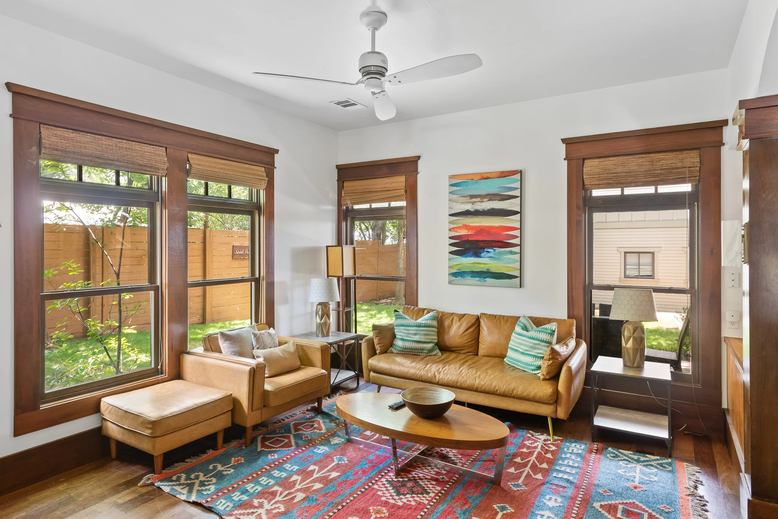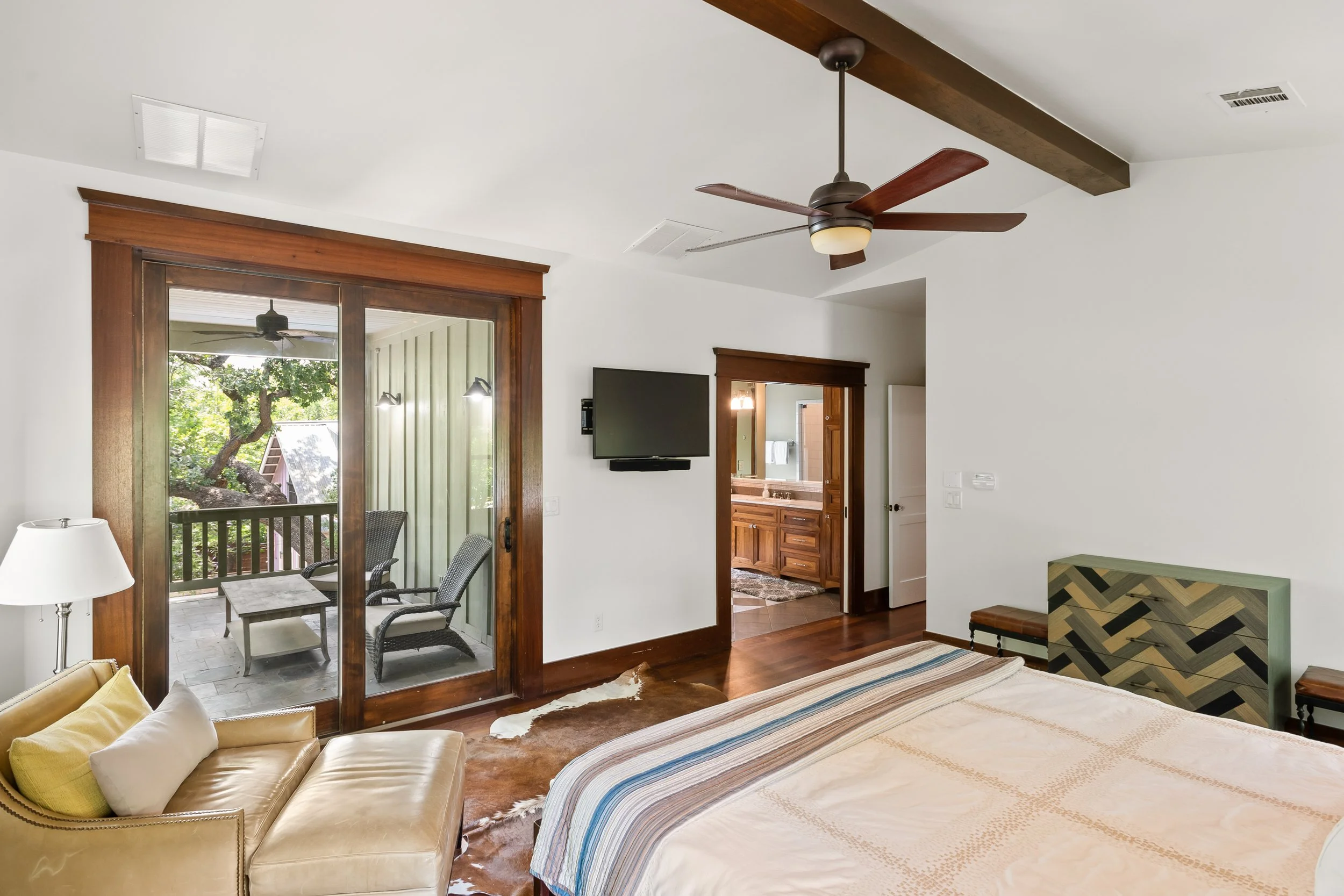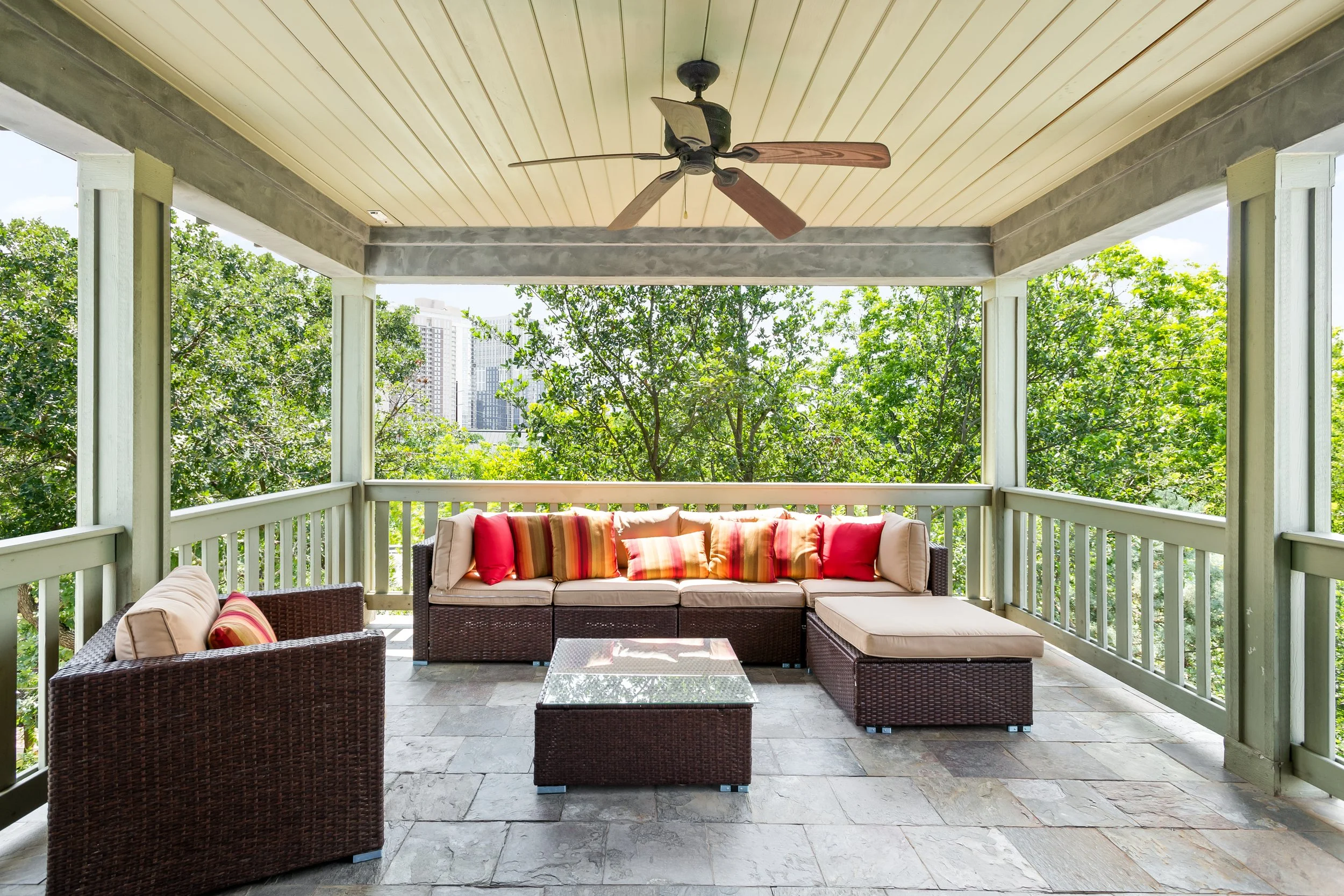 The 3rd floor has a couch, TV, fireplace, and wet bar, making it a private den for entertainment. The doors open up onto a balcony with additional seating, giving you unobstructed, gorgeous views of Downtown Austin and the State Capitol.